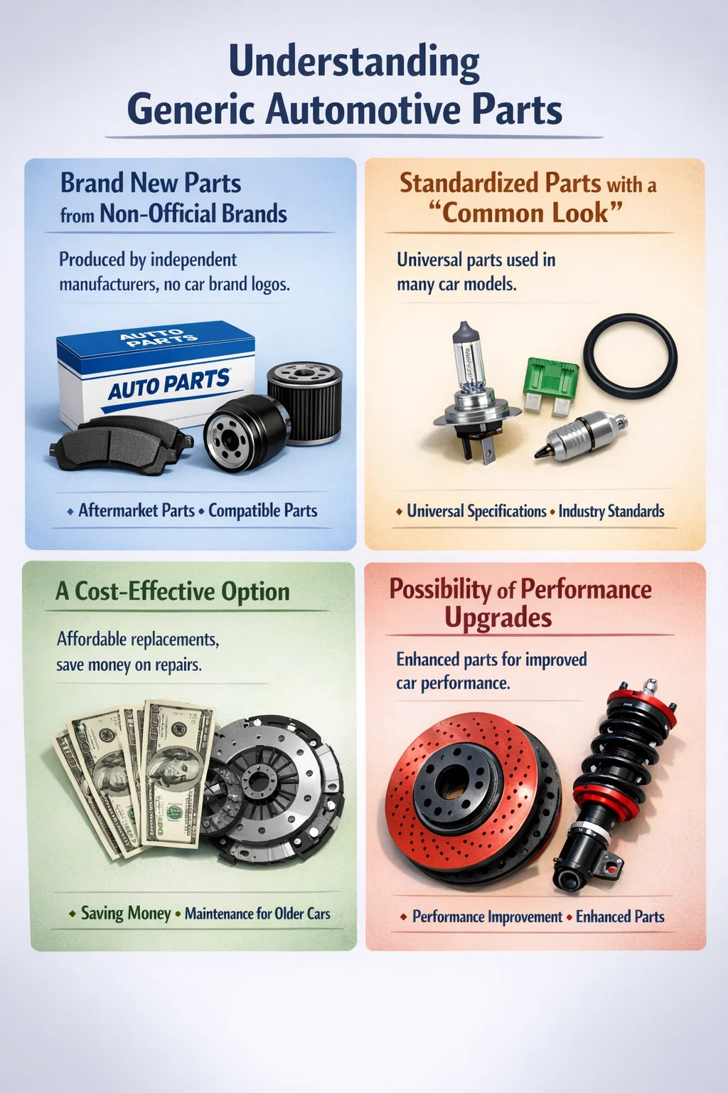 «Общие детали» или «альтернативные детали бренда» — это то, что мы обычно называем автомобильные детали которые не производятся непосредственно производителем автомобиля, но прекрасно устанавливаются на автомобиль. Вы можете думать о них как о «непатентованных лекарствах» в фармацевтической промышленности или «сторонних аксессуарах» для мобильных телефонов.